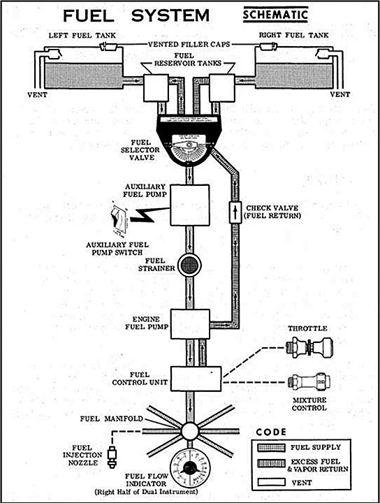 Fuel is supplied to the engine from two tanks, one in each wing [Figure 2]. […] Fuel from each wing flows through a fuel reservoir tank [located under the cabin floor] to the fuel selector valve. Depending upon the setting of the selector valve, fuel from the left or right tank flows through a by-pass in the electric auxiliary fuel pump (when it is not operating) and fuel strainer to the engine-driven fuel pump. From here, fuel is distributed to the engine cylinders via a fuel control unit and manifold.