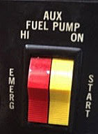 The red left half of the switch is labelled EMERG, and its upper HI position is used in the event of an engine-driven fuel pump failure during take-off or high-power operation. […] Maximum fuel flow is produced when the left half of the switch is held in the spring-loaded HI position. In this position, an interlock within the switch automatically trips the right half of the switch to the ON position. When the spring-loaded left half of the switch is released, the right half will remain in the ON position until manually returned to the off position. Footnote 21