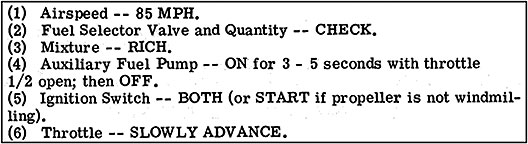 While gliding toward a suitable landing area, an effort should be made to identify the cause of the engine failure. If time permits, and an engine restart is feasible, the following procedure applies: Footnote 28