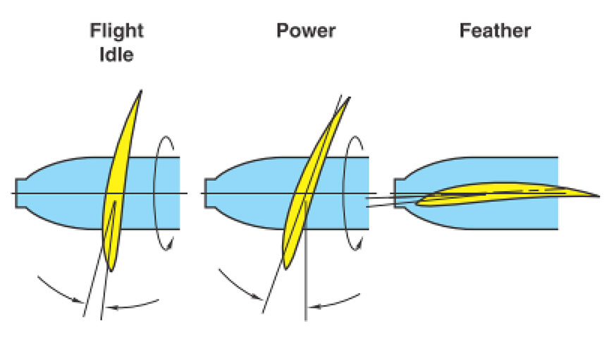 As the propeller blade angles increase, the blades take a larger bite of air, resulting in a decrease in rpm until they reach a feathered position. In a feathered position, the blades are directly in line with the air stream and produce very little dynamic force. Conversely, as propeller blade angles decrease, the blades take a smaller bite of air, resulting in an increase in rpm.