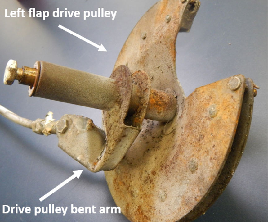 The arm attached to the flap drive pulley in the left wing was bent almost 90° from its original position as a result of tensile overload (Figure 3). It is possible that this damage occurred during the impact sequence. However, there was no corresponding damage to the left flap, which is connected to the drive pulley arm via a push-pull rod. It is also possible that the bending of the drive pulley arm occurred during operation of the flaps. If the left flap was unable to move, the arm may have been bent from the cable tension produced by the flap actuator.