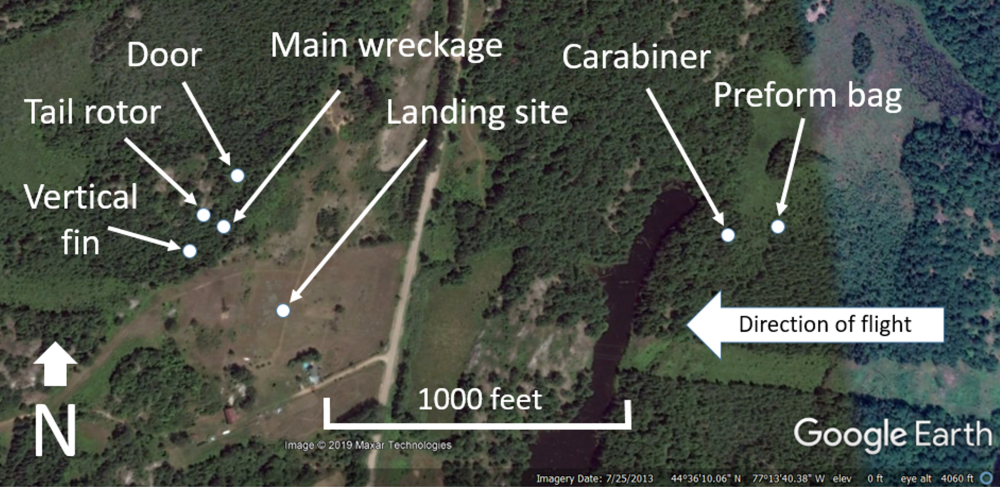The loss of the tail rotor and vertical fin resulted in the helicopter becoming uncontrollable, and during its uncontrolled rapid descent it struck nearby trees and then the ground. The helicopter was destroyed during the accident sequence (Figure 2).