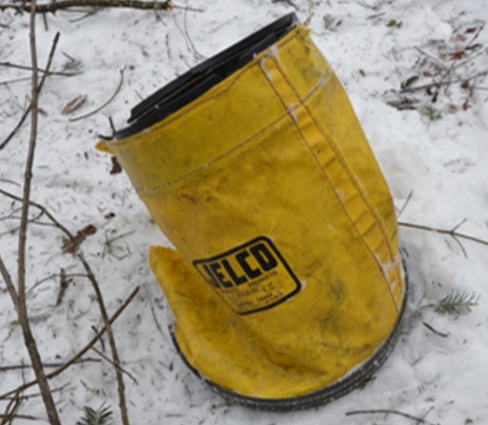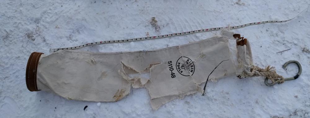 At 1145:54, the pilot started the descent to land. At 1146:09, the helicopter was about 0.26 NM from the staging area and travelling at a speed of 51 knots at 230 feet AGL when a 4‑foot‑long empty canvas supply bag (referred to in this report as a “preform bag”)Footnote 6 with an attached carabiner struck the tail rotor and broke the tip off one of the tail rotor blades, including the balance weight.