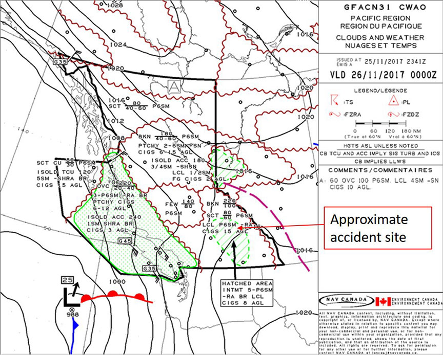 According to the graphical area forecast (GFA) (Figure 3), the forecast for the eastern part of British Columbia—within the Rocky Mountains and along the route to CZVL—was as follows: scattered clouds based at 6000 feet ASL with tops at 8000 feet ASL; a broken layer of clouds based at 10 000 feet ASL with tops at 22 000 feet ASL; and visibility greater than 6 sm. Also, localized ceilings were forecast at 1500 feet AGL with light rain. An area near Glacier National Park and Rogers Pass was forecast to have intermittent ceilings at 800 feet AGL with mist and light rain, and the visibility was forecast to vary between 5 sm and greater than 6 sm. Sunset for Revelstoke on 25 November 2017 was at 1554.