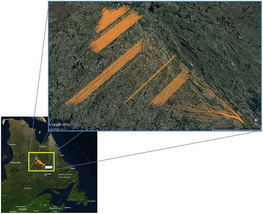The magnetometric survey work was conducted at low altitude (300 feet above ground level [AGL]) above an area determined according to a flight profile pre-established by the client. Each aircraft had on board 2 pilots, who took turns as pilot flying during flight segments generally spread over 2 daily flight blocks lasting up to 5 hours each. A typical flight block consisted of a takeoff from Schefferville Airport, which was considered the operating base; a flight segment to the survey area; multiple parallel flight segments at an altitude of 300 feet AGL within the survey area; and a return flight segment followed by a landing at the base (Figure 1).