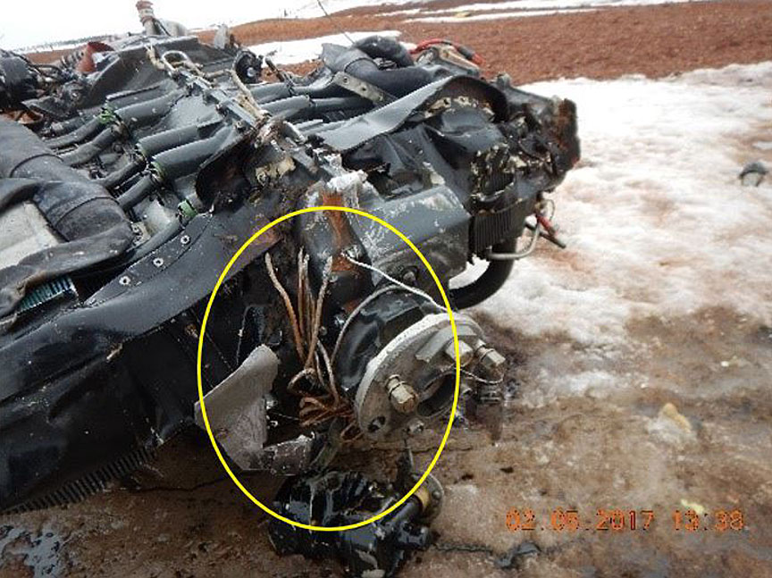 The aircraft wreckage was found at the top of the plateau, about 134 feet east of the initial point of impact with the ground (Figure 4). The left engine was separated from the wreckage (Figure 5) and was found slightly farther away, with the propeller. Sections of the conductor cables were wrapped around the left engine propeller drive shaft. All main sections of the aircraft were accounted for. The flaps and landing gear were in the retracted position. The throttle levers were at maximum power.