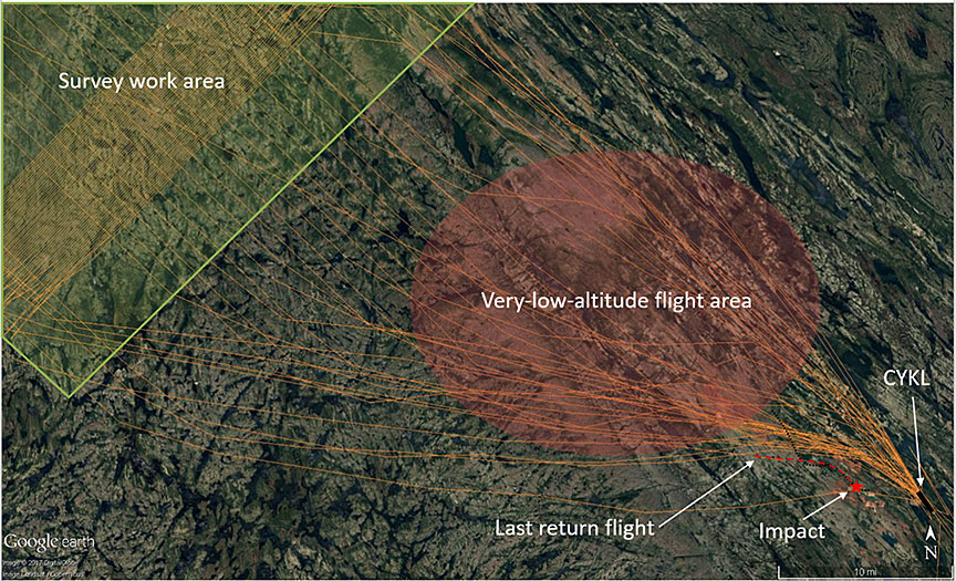The pilots arrived at CYKL on 11 April and began the magnetometric survey work the next day. Over the 19 following days, the 2 pilots conducted 21 magnetometric survey flights in 12 working days. The 2 pilots accumulated about 94 flying hours, with a daily average of 7.8 flying hours and 10.3 hours of flight duty time.