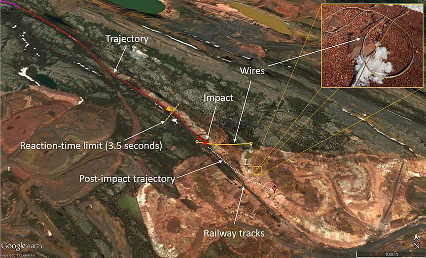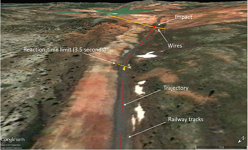 As the aircraft was approaching this limit, the pilot had to turn right to remain above the railway tracks, creating a situation that was not conducive to a longer-distance visual scan to detect the wires. During the turn, the aircraft passed the point (Figure 9) at which there was insufficient reaction time to avoid the wires.