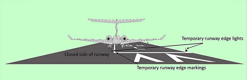 In this occurrence, when the flight crew had the runway in sight, the markings of Runway 06L did not prompt the realization that the north side of the runway was closed: there were no Xs on the closed portion; the original touchdown zone and runway centreline markings were still visible; the temporary runway lights placed near the runway side stripe markings were not visible from a distance; and the flight crew interpreted the side stripe marking indicating the left edge of the runway as the centreline. As a result, the flight crew did not realize that they were landing the aircraft on a closed portion of the runway.