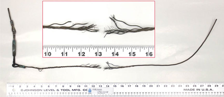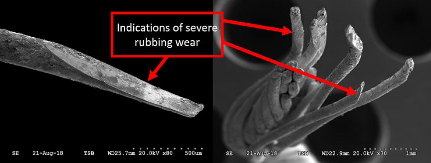 - 52 of the split wires (39% of the total) exhibited severe rubbing wear (Figure 2), which contributed to the fracturing. These fractures likely occurred prior to the tensile overload.