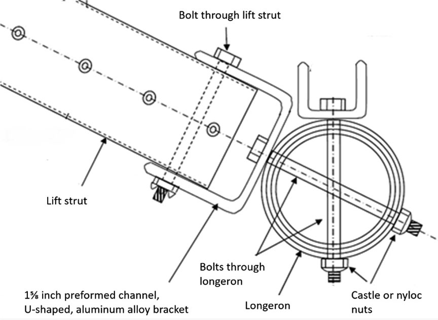 The wings are supported by lift struts that are attached to the fuselage with 1⅝ inch preformed channel, U-shaped, aluminum alloy brackets. The brackets are attached to the lift struts using a bolt that passes through the bolt holes on each leg of the bracket and through a pre-drilled hole in the lift strut. The brackets and struts are then attached to the fuselage longeron using a bolt that passes through a bolt hole in the centre base plate of the bracket. Castle nuts or nyloc nuts are used to secure the bolts (Figure 2).