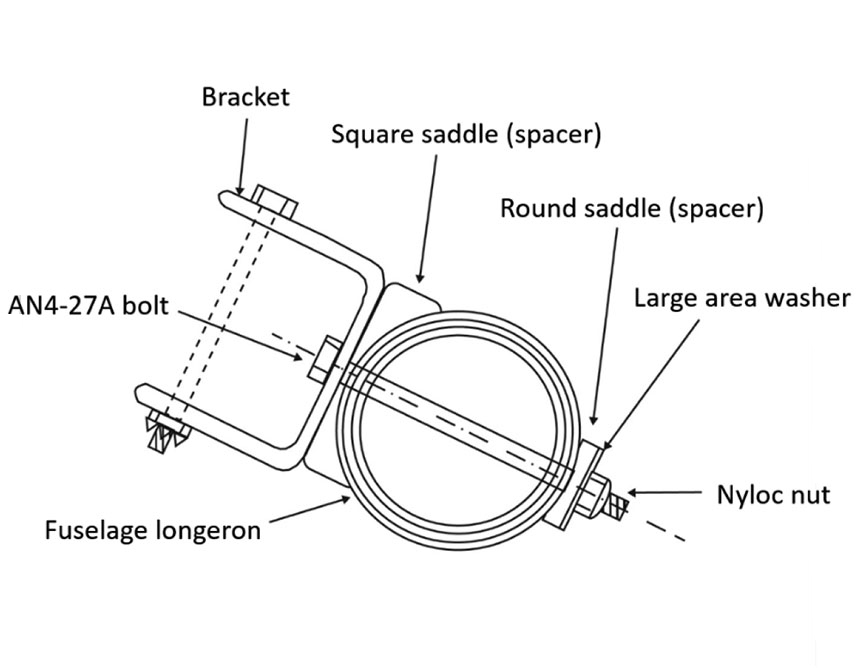 The heavy load saddle kit was developed to provide the Light Sport version of the Challenger ultralight aircraft with greater lift and performance capabilities. It is a set of 2 spacers fitted to the fuselage longeron and provides a flat surface area at the attachment point with the bracket (Figure 3).