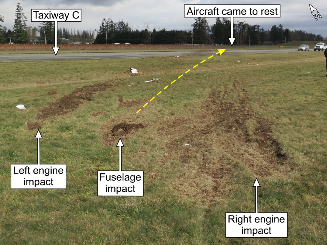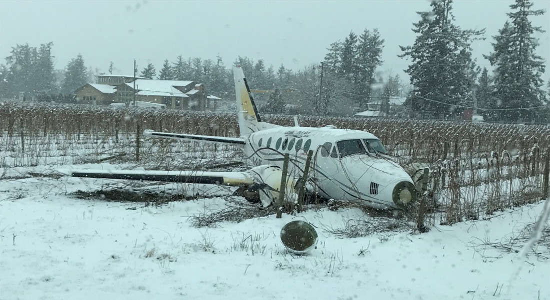 On 23 February 2018, at 1204 Pacific Standard Time, an Island Express Air Inc. Beechcraft King Air B100 aircraft (registration C-GIAE, serial number BE-8), departed Runway 07 at Abbotsford Airport, British Columbia (BC), on a day instrument flight rules flight to San Bernardino International Airport, California, United States. On board were the pilot and 9 passengers. It was snowing at the time of departure. A few seconds after taking off, the pilot raised the landing gear. At that same moment, the aircraft veered to the left and struck the ground just north of Runway 07. Five passengers and the pilot were seriously injured. The other 4 passengers received minor injuries. The aircraft was destroyed by impact forces. The aircraft's emergency locator transmitter activated and was detected by the Cospas-Sarsat search and rescue satellite system.