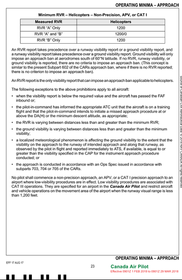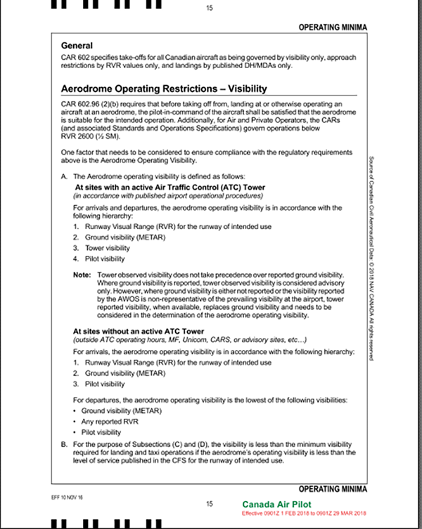 To determine whether an aircraft can legally land at an aerodrome in Canada, consideration must first be given to the operational restrictions that apply to the aerodrome in question to ensure that the aerodrome is suitable for the manoeuvre being executed.Footnote 111 One of the determining factors is the aerodrome’s operating visibility, which is defined in the Canada Air Pilot (CAP 5) in the general pages pertaining to operating minima.Footnote 112 This operating visibility limit is published in the Canada Flight Supplement (CFS), specifically in the box reserved for runway information. If an aerodrome’s operating visibility limit is not published in the CFS, it means that operations are not authorized when visibility is less than ½ statute mile (SM).