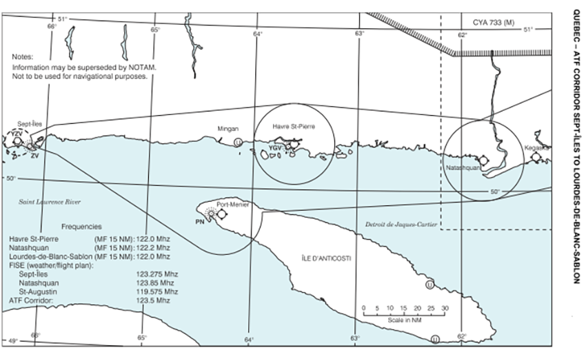 At 1059, the aircraft reached cruise flight at 11 000 feet above sea level (ASL). At 1108, 9 minutes after levelling off at 11 000 feet ASL, the crew began the descent and contacted Madeleine RadioFootnote 10 on the mandatory frequency (MF) to report that they planned to arrive at CYGV at 1118, which was 10 minutes later.