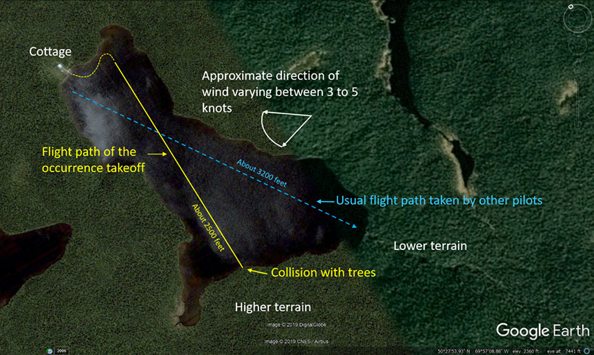 In this occurrence, the initial intention was to take off in an arc from the bay northeast of the cottage toward the lower terrain. However, according to the information gathered, the actual take-off path was largely in a straight line until the point of impact. The flight path toward the higher terrain required the aircraft to fly over the higher terrain at low altitude or to turn left immediately after takeoff to avoid the higher terrain. Furthermore, a greater take-off distance may have been required because the aircraft was heavier.