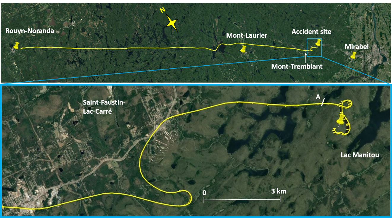 C-FSII was located the next day, 20 November 2018, at 1604, in a wooded area on the side of a hill, approximately 5 NM west of Sainte-Agathe-des-Monts, Quebec.Footnote 7 The extent of the student pilot’s injuries were such that there would have been no chance of survival, even if the helicopter been found sooner. The helicopter had sustained substantial damage, but there was no post-impact fire.