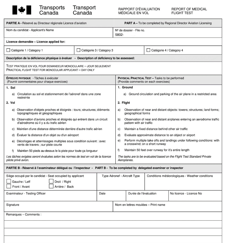 In the case of the student pilot, the practical flight test form was completed by the regular instructor, who based it solely on his previous dual-flight experience with the student pilot, rather than completing an evaluation check flight, contrary to regulatory requirements. Data gathered indicated that the fact that the instructor assessing the monocular condition was also the student’s regular instructor did not constitute a conflict of interest.