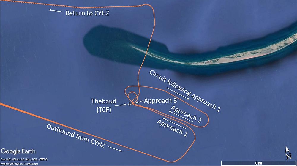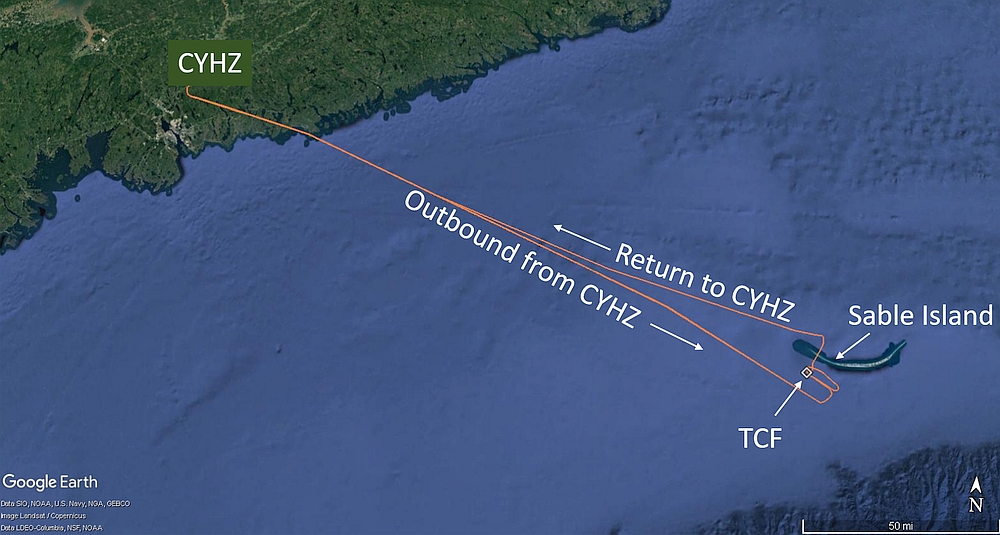 Unbeknownst to the pilots, airspeed had increased to 148 KIAS, while descending through 650 feet RADALT at 1700 fpm. The PF recognized and arrested the descent at approximately 480 feet ASL (463 feet RADALT) as the helicopter was passing over the northwestern tip of Sable Island.Footnote 27 The captain then increased collective to regain the lost altitude. The pilots were unaware that the helicopter had overflown Sable Island. The helicopter was levelled off at 1500 feet ASL and the pilots assessed their options. Knowing that there were low clouds and visibility in the vicinity of the TCF and Sable Island, the pilots decided to return to CYHZ, where weather conditions would permit a visual flight rules (VFR) approach to landing.