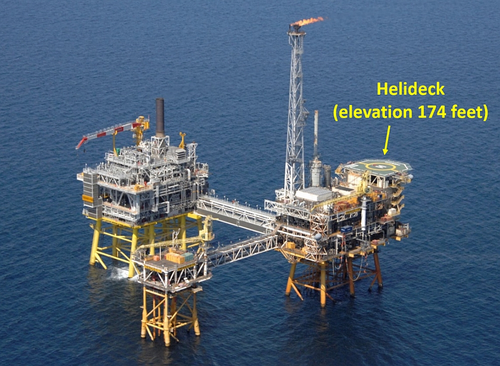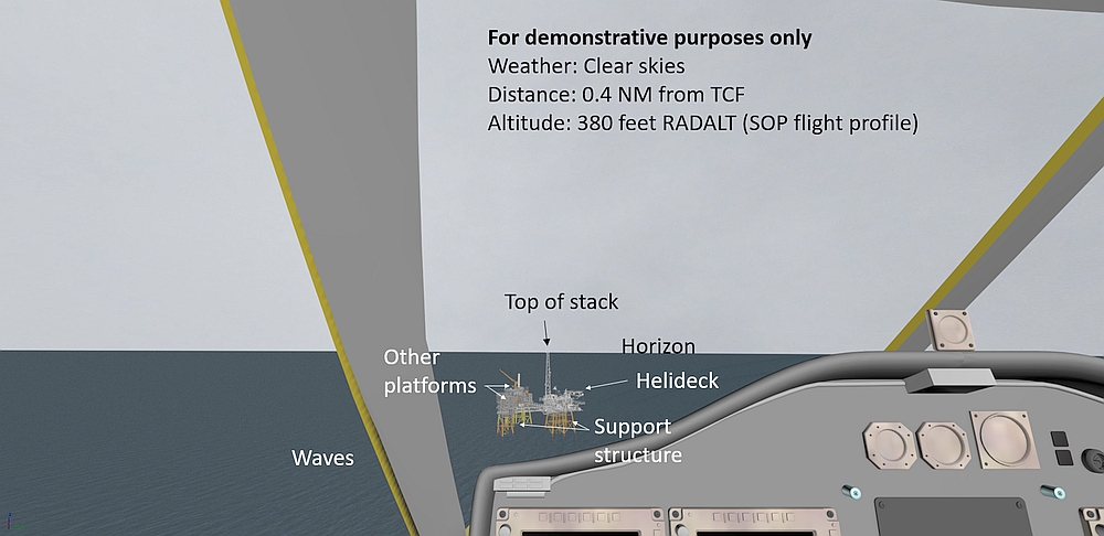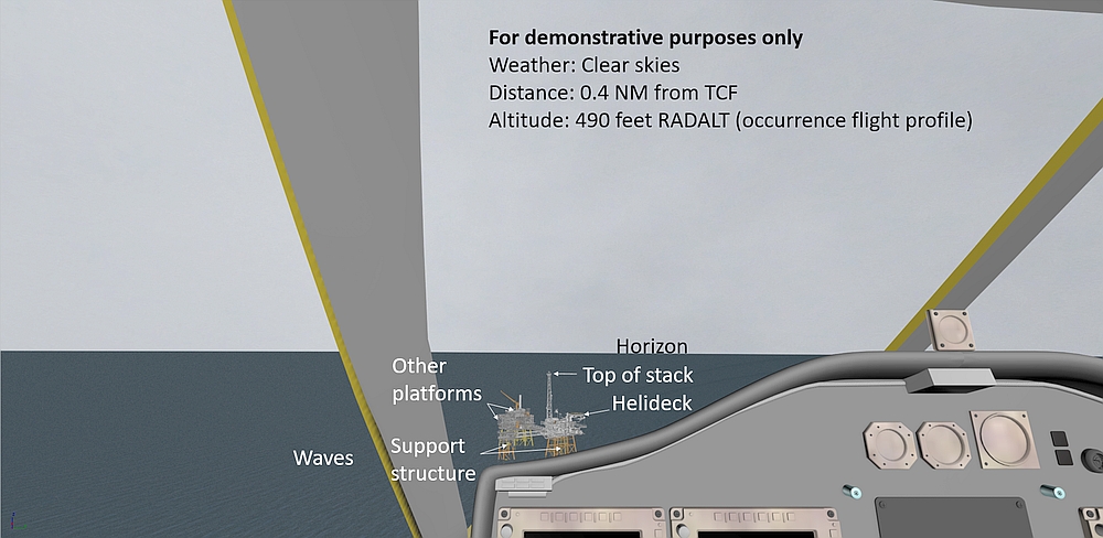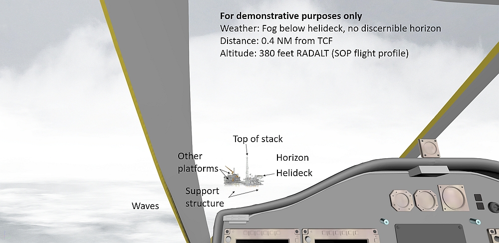 The first officer stowed his approach plate, and prepared to take control. Because the first officer was seated in the left seat, he did not have visual contact with the TCF until the helicopter rolled out on final. When the helicopter rolled out, the captain transferred control to the first officer (who was now the PF). The helicopter was still flying above the fog layer, and both pilots had a clear line of sight to the helideck. The estimated flight visibility was approximately 3 SM in the direction of the TCF; however, there was no discernible horizon behind the TCF.