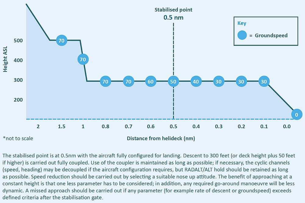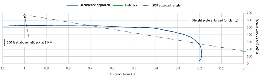 At 1333:04, the PF depressed the cyclic autopilot disengage button to disengage the RADALT hold, then depressed and held the cyclic trim release button to hand-fly the approach. At the same time, the PF lowered the collective (decreased from approximately 45% engine torque to 27% engine torque), using the collective trim release trigger, to commence the descent. The descent commenced when the helicopter was 0.43 NM from the TCF, on a 7.1° approach angle to the helideck. The PM recognized that the approach was steeper than the company’s standard 4.7° approach angle; however, it did not alarm the PM because some company pilots preferred flying a steeper visual approach profile.Footnote 15 The PF asked the PM for the helicopter’s groundspeed, to which the PM replied it was approximately 60 knots.