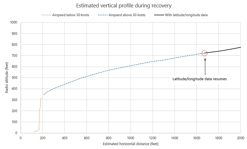 The captain, who could see the water and the TCF to the right of the helicopter, formally took control of the helicopter and began a near-vertical visual climb up to 150 feet RADALT, crosschecking with the standby instruments due to reduced visibility in fog. Some right yaw persisted during the climb and gradually reduced as the helicopter continued to climb. The aircraft flew in a widening right turn away from the vicinity of the upset and toward the northeast, accelerating from 30 KIAS to 80 KIAS (dashed zone shown in Figure 4; a detailed profile view is shown in Appendix B). A high-power setting (110–120% engine torque) was maintained during the initial climb and the Nr slowly increased, generally returning to 105% Nr at around 375 feet RADALT. As the helicopter climbed above 650 feet RADALT, engine torque was reduced to 100%, and continued steadily downward to approximately 70% as the helicopter reached 1350 feet RADALT.