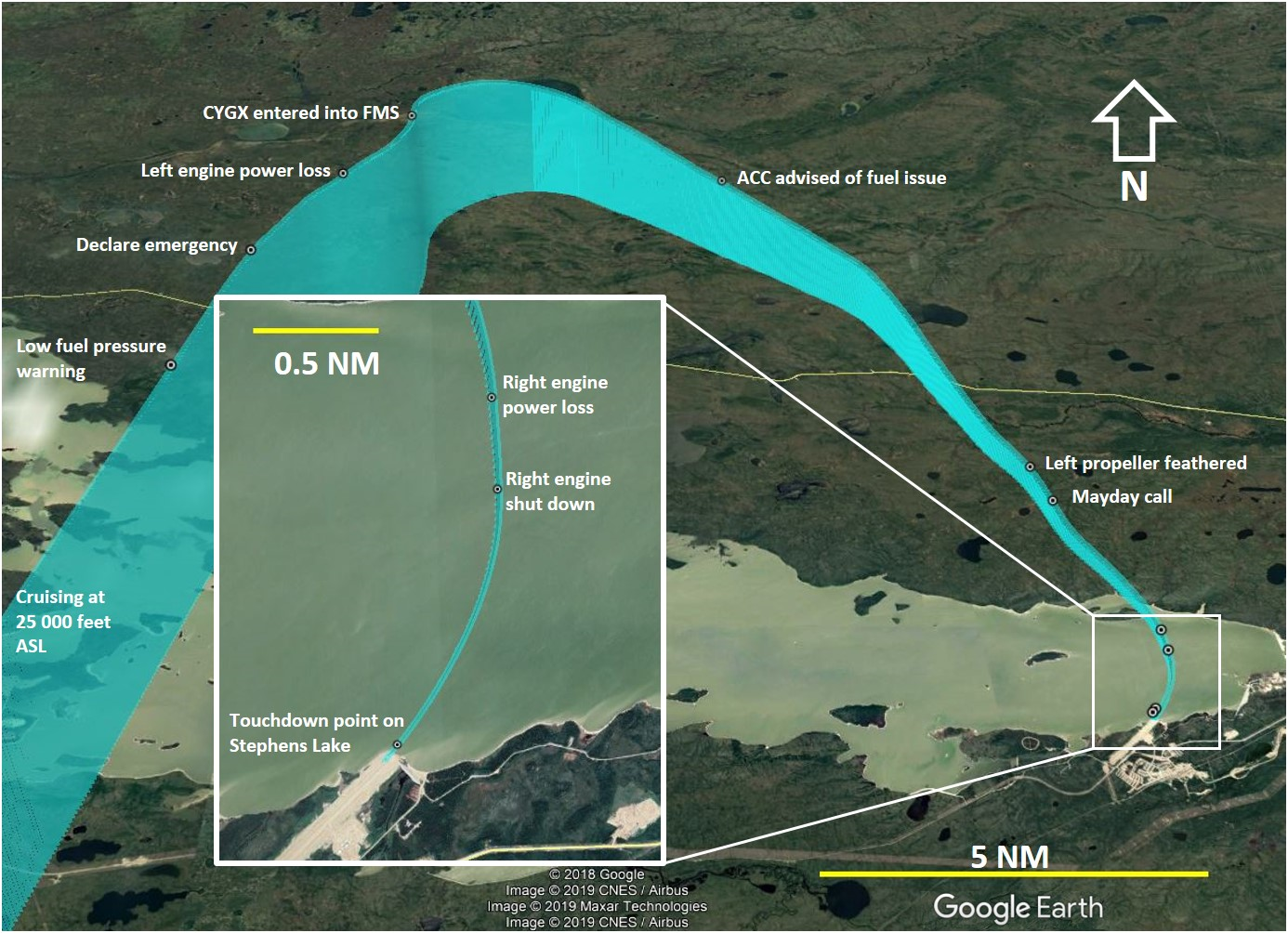 - The right engine lost power due to fuel exhaustion when the aircraft was 1 nautical mile from Runway 23. From that position, a successful forced landing on the intended runway was no longer possible and, as a result, the aircraft touched down on the ice surface of Stephens Lake, short of the runway.