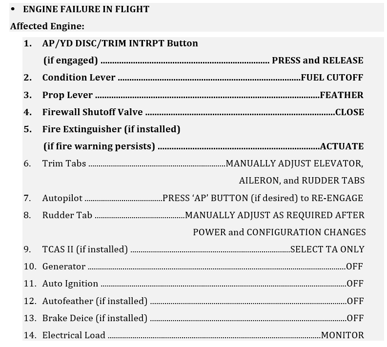 When the left engine lost power, the flight crew followed the procedure in the Emergency and Abnormal Procedures Quick Reference Handbook (QRH) to shut down the engine. However, from 1815 to 1821, the left propeller continued to windmill at speeds between 1300 and 2000 rpm. It is likely that the propeller control lever had not been moved completely into the feather position.