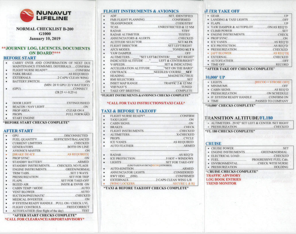 The aircraft manufacturer’s Beechcraft Pilot’s Check List—Normal Procedures, which is carried in the aircraft but not used routinely, contains 3 items that refer to fuel quantity after the PREFLIGHT INSPECTION; 2 of these items are in checks that are to be conducted before takeoff. However, these 2 pre-takeoff items have been omitted from the company-developed, laminated Normal Checklist B-200 G1000 that had been drawn up from the Keewatin Air SOPs.