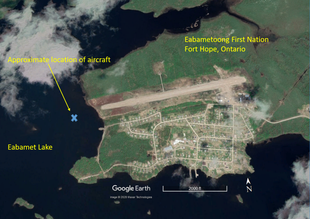 At approximately 0140, the aircraft departed CYFH with the first officer acting as the pilot flying (PF), seated in the right seat, and the captain acting as the pilot not flying (PNF), seated in the left seat. Shortly after takeoff, the PF called for the landing gear to be retracted. The PNF then selected the gear up at approximately 200 feet above ground level (AGL). Both engines subsequently lost power simultaneously, and the flight crew executed a forced landing on Eabamet Lake, Ontario, in total darkness (Figure 1).