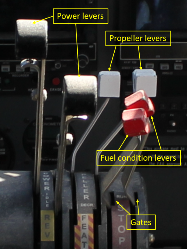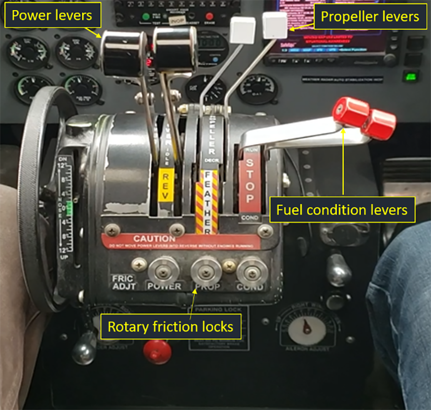 The throttle quadrant consists of power levers, propeller levers, fuel condition levers, and rotary friction locks (Figure 2).
