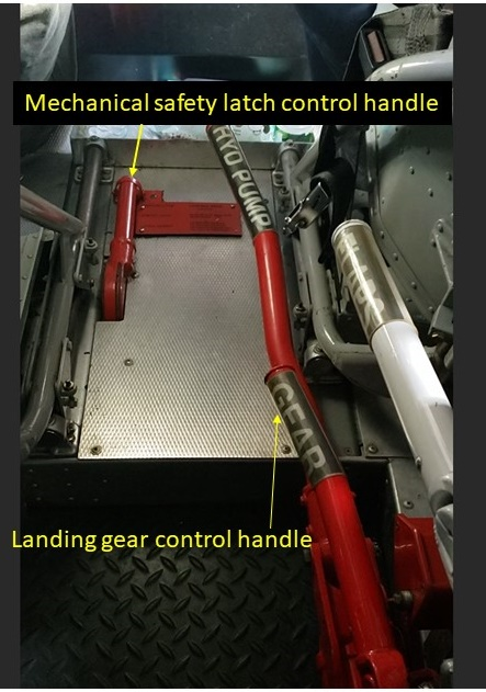 Transportation Safety Board of Canada (TSB) investigators conducted a trial of unintentional movement of the fuel condition levers while reaching for the mechanical safety latch control handle and the landing gear control handle, located on the cockpit floor between the pilot seats (Figure 3), in a DC3-TP67 representative of the occurrence aircraft. This trial was performed during the day while the aircraft was on the ground, with the engines turned off, in a static environment. While the aircraft is on the ground, it is impossible to lift the landing gear handles. During the initial phase of a climb at night, lighting is limited in the cockpit, the aircraft attitude is pitched nose-up, and the crew is in a dynamic environment. The main observations from the TSB’s limited trial were as follows: