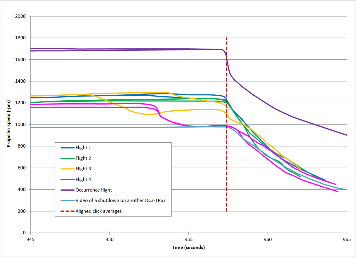 The analysis of the acoustic signatures found that the timing of the clicks heard during the normal engine shutdowns corresponded to an immediate reduction in propeller speed. This phenomenon was also observed in a video of a shutdown filmed on another DC3-TP67 operated by North Star Air Ltd. (North Star Air).
