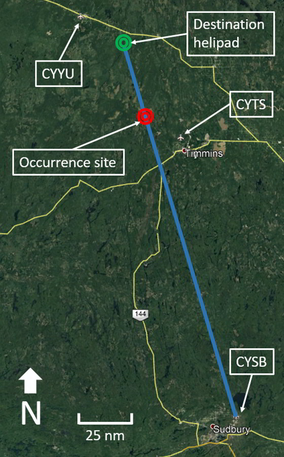 On 04 March 2019, the privately registered Robinson Helicopter Company R66 helicopter (registration C-GAUA, serial number 0142) departed Sudbury Airport (CYSB), Ontario, at 1842Footnote 1 on a visual flight rules (VFR) flight to a private helipad near Fauquier-Strickland, Ontario, with the pilot and 1 passenger on board. The helicopter collided with terrain at 2006, 36 nautical miles (nm) south-southeast of its destination (Figure 1).