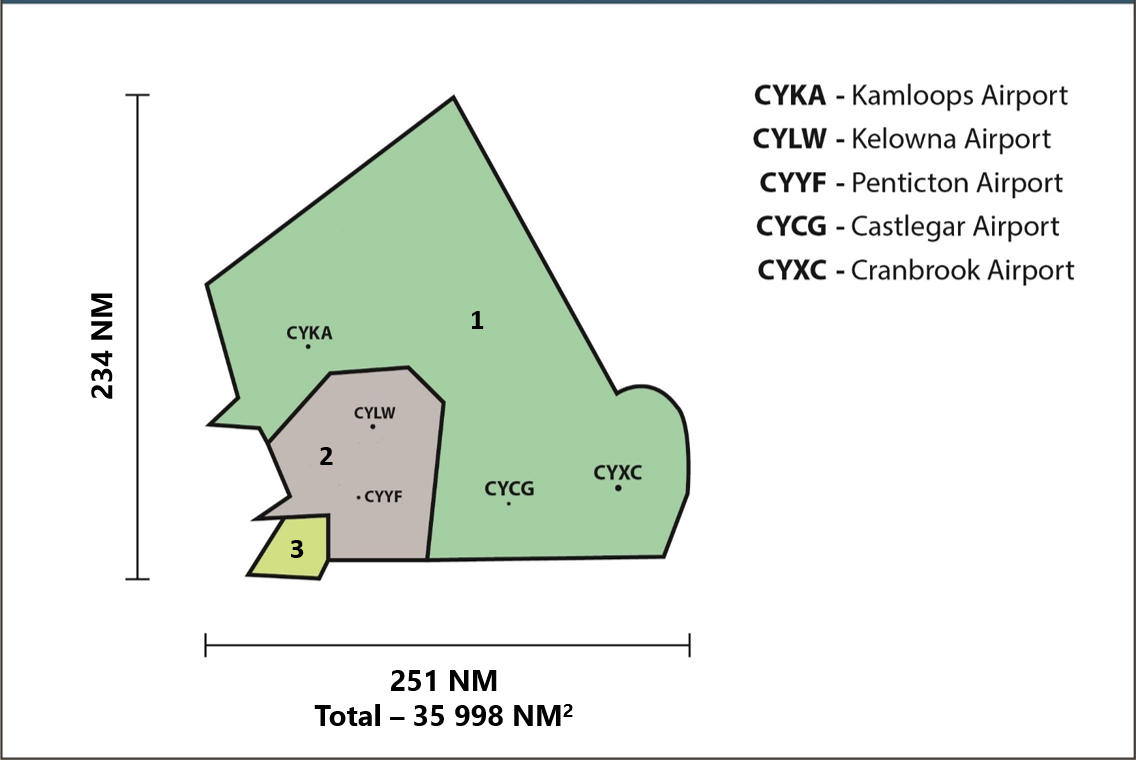 The Vancouver Area Control Centre (ACC) airspace is divided into several specialties, including the Airports Specialty. The Airports Specialty includes the Kamloops (KA) sector and the Kelowna (LW) sector. At the time of the occurrence, there were only a few aircraft inbound to land at Kelowna International Airport (CYLW), and so the LW sector was combined with the KA sector as the KALW sector. See section 1.3.2 for more information about the Vancouver ACC airspace.