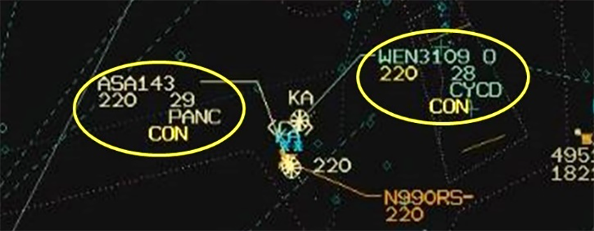 At 1000:00, the Piaggio’s target appeared on the CSiT. At 1000:14, the KALW sector controller observed a problem with the target: the Piaggio was in fact displayed as 2 targets. One target was showing as Air Alaska flight 143 (ASA143) en route to Ted Stevens Anchorage International Airport (PANC), Alaska, United States, and a 2nd target displayed as N990RS, which was the Piaggio’s registration. The correct target was the one showing as ASA143; this target had a CAATS disparity errorFootnote 10 associated with it, indicated by the notation < CT > (Figure 3).