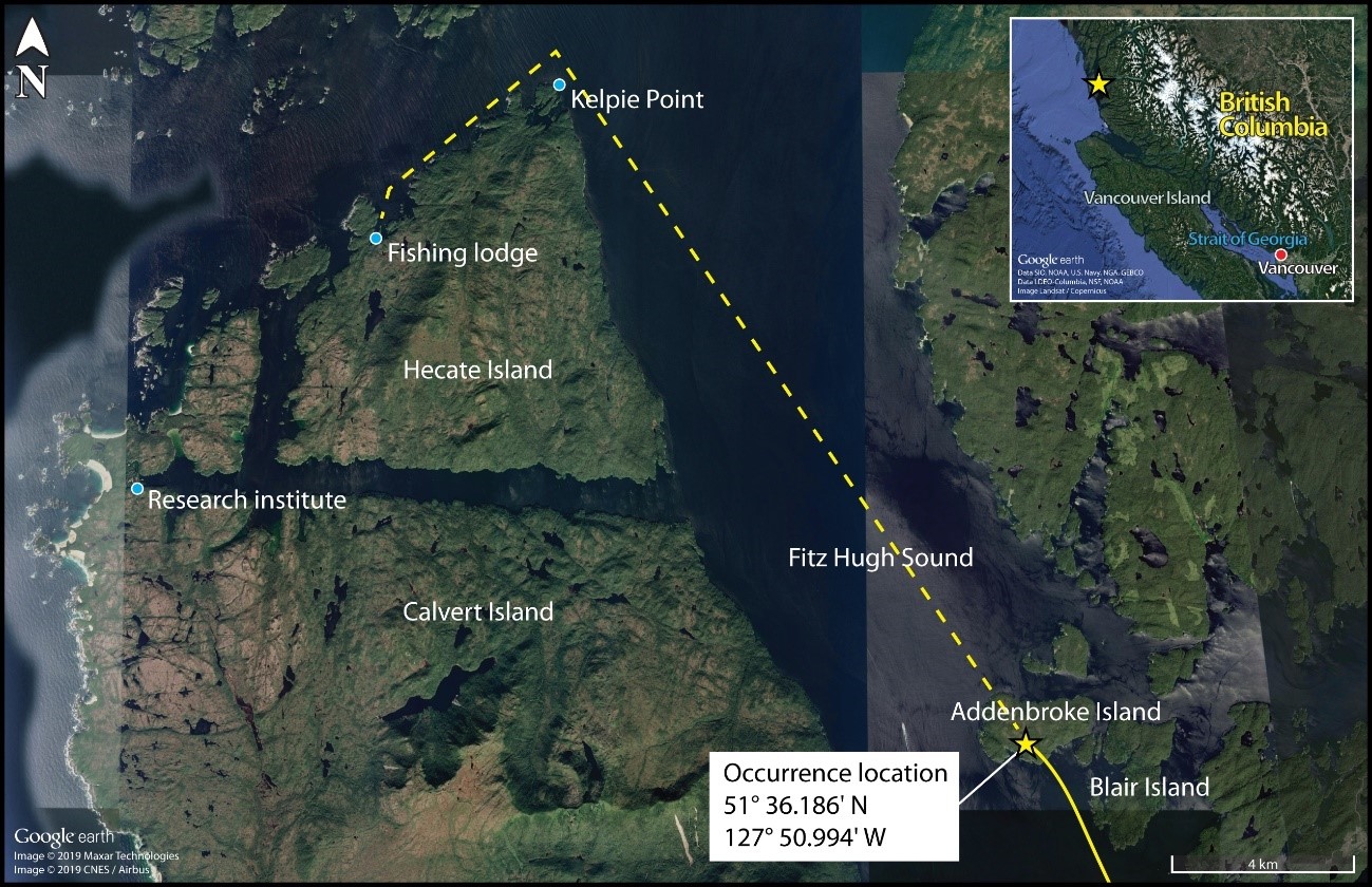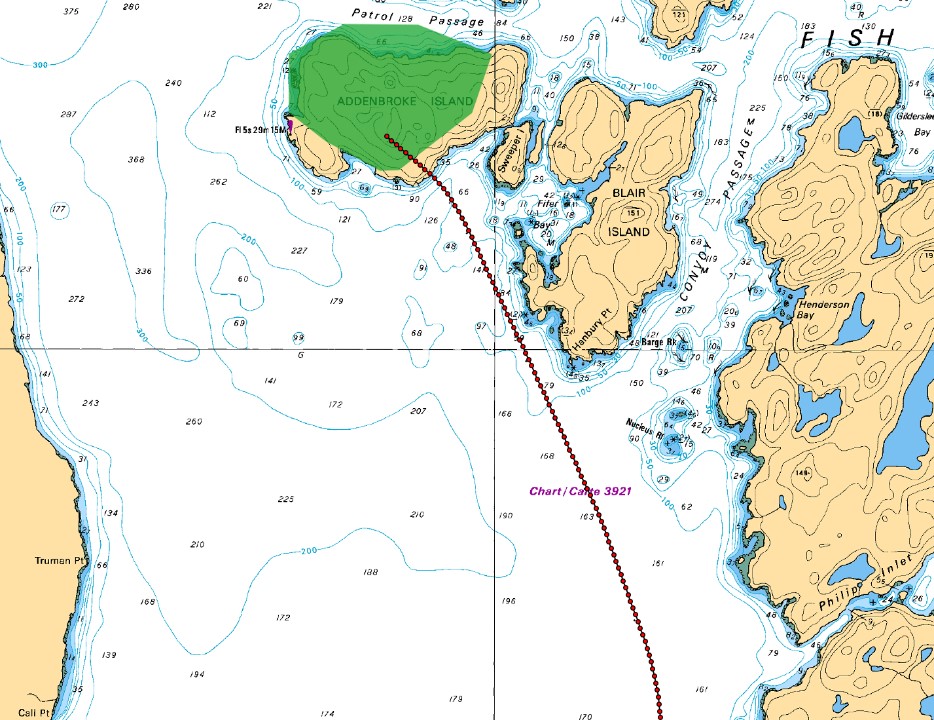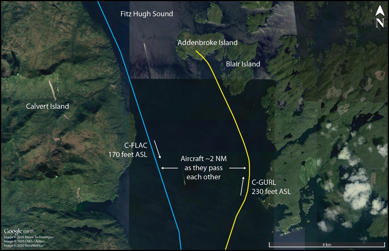 As the southbound C-FLAC entered Fitz Hugh Sound from the north at Hecate Island, the occurrence aircraft entered Fitz Hugh Sound from the south, near the southern tip of Calvert Island. The occurrence aircraft then changed course from the western to the eastern shoreline, and descended again to about 230 feet ASL (Figure 2), while maintaining an airspeed of approximately 125 knots.