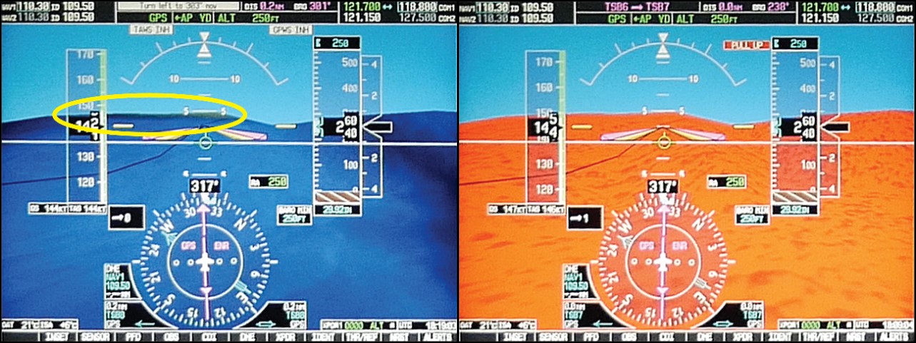 - The configuration of the visual and aural alerting systems and the colouration ambiguity in the primary flight display of the Garmin G1000 was ineffective at alerting the occurrence pilot to the rising terrain ahead.