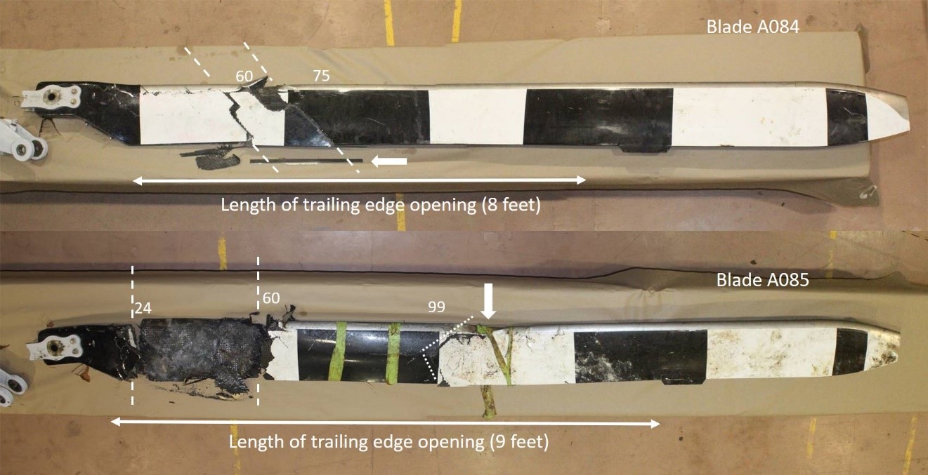 | Trailing edge bond joint | Fracture of bond joint between lower skin and trailing edge strip for 8 feet. | Fracture of bond joint between upper skin and trailing edge strip for 9 feet. |