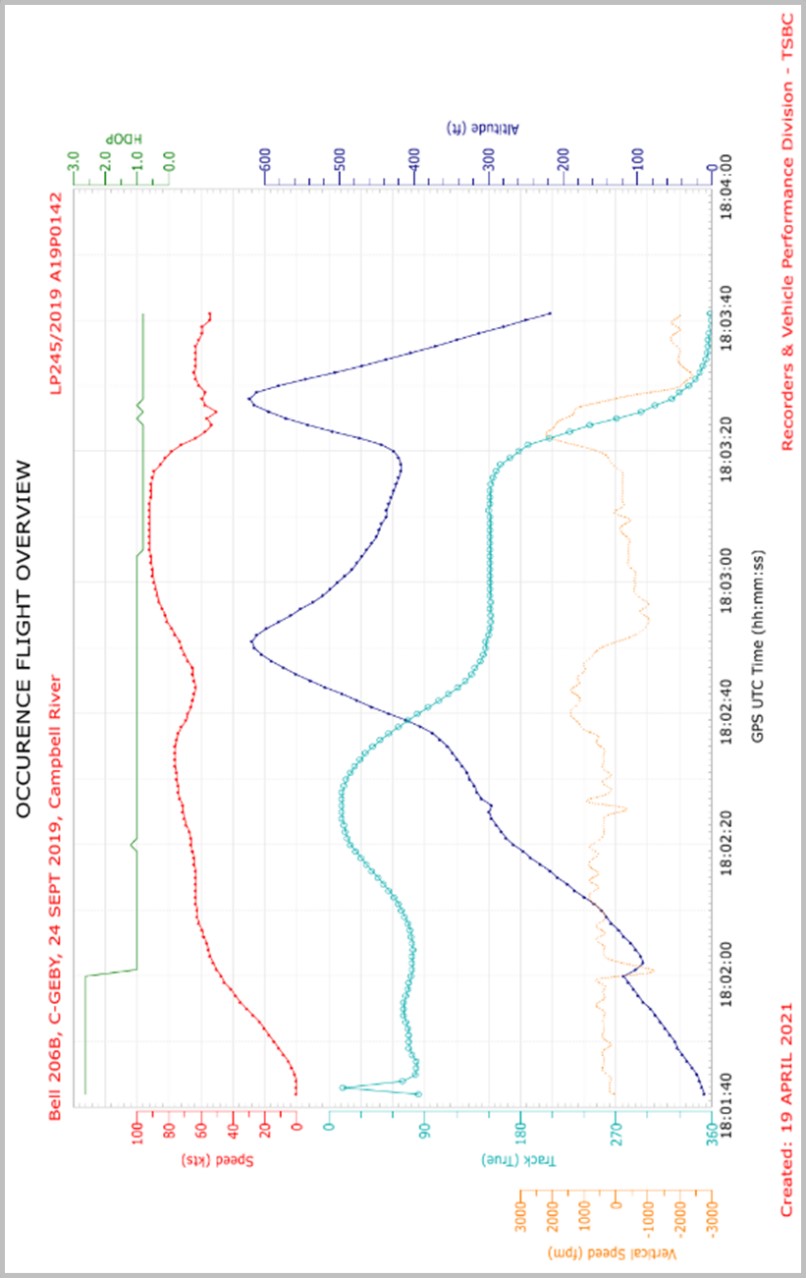 GPS (global positioning system) data showed that, during the occurrence flight, the helicopter conducted a 180° course change with a fairly tight turn radius and an abrupt climb with decreasing ground speed. Since the original flight path headed toward water, this manoeuvre was consistent with a situation involving the pilot responding to an abnormality of some kind and setting the helicopter up for an emergency landing on land.
