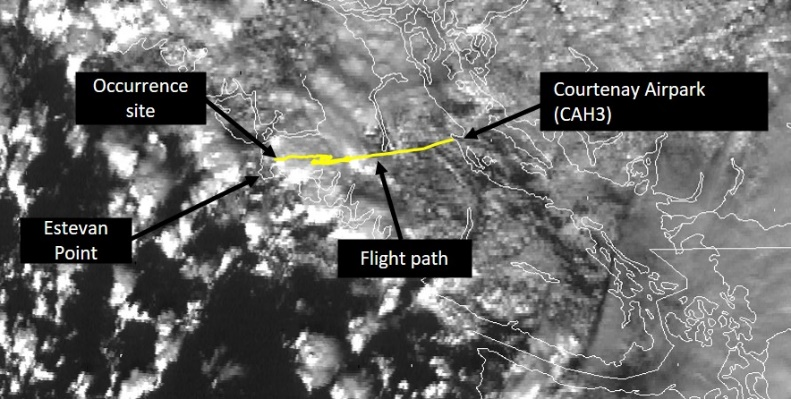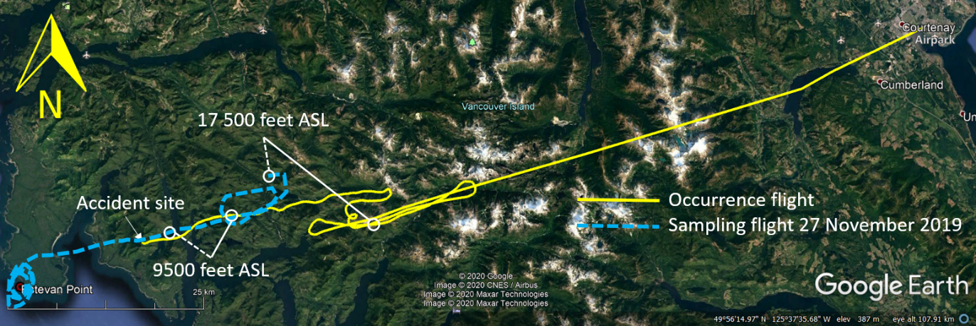 On 21 December 2019, the privately registered Cessna 172H aircraft (registration C-GECG, serial number 172-55070) was conducting a visual flight rules (VFR) flight from Courtenay Airpark (CAH3), BC, with only the pilot on board. Shortly after departing CAH3, the aircraft appeared on radar at 1132Footnote 2 climbing through 1900 feet ASL. At 1203, the aircraft levelled off at 17 400 feet ASL. For the next 15 minutes, it followed the planned flight path for the air-sampling mission with a pattern of flight consistent with previous air-sampling flights, including a transponder code change at 1214.