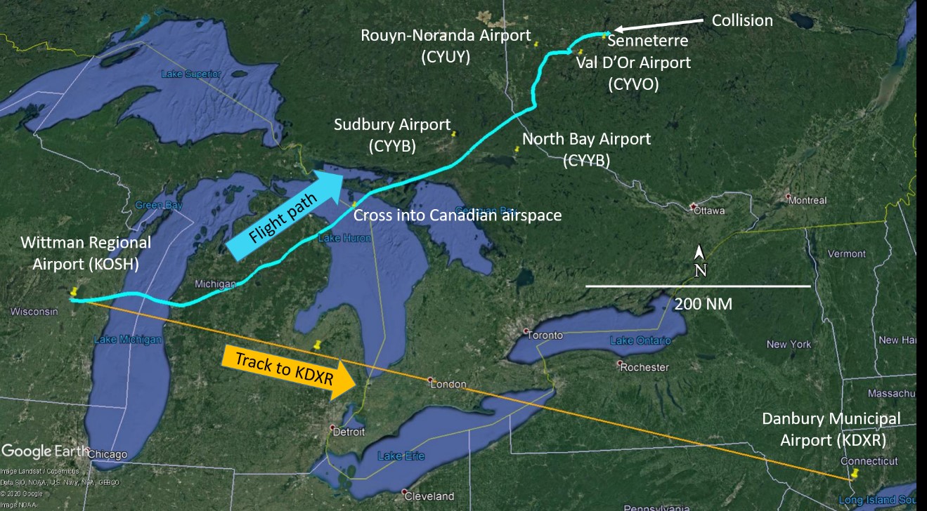 At 1555Footnote 1 on 29 July 2019, the Beechcraft Bonanza V35B aircraft (U.S. registration N3804X, serial number D-10358) departed Wittman Regional Airport (KOSH), Wisconsin, U.S., for a daytime visual flight rules (VFR) flight to Danbury Municipal Airport (KDXR), Connecticut, U.S., with only the pilot on board. Within minutes, the aircraft turned approximately 15° north of a direct flight path to KDXR.Footnote 2 At 1610, the aircraft climbed through 10 000 feet above sea level (ASL) and levelled off at approximately 11 500 feet ASL. As the flight progressed, the aircraft deviated toward the north and never regained a track or heading toward the original destination (Figure 1).