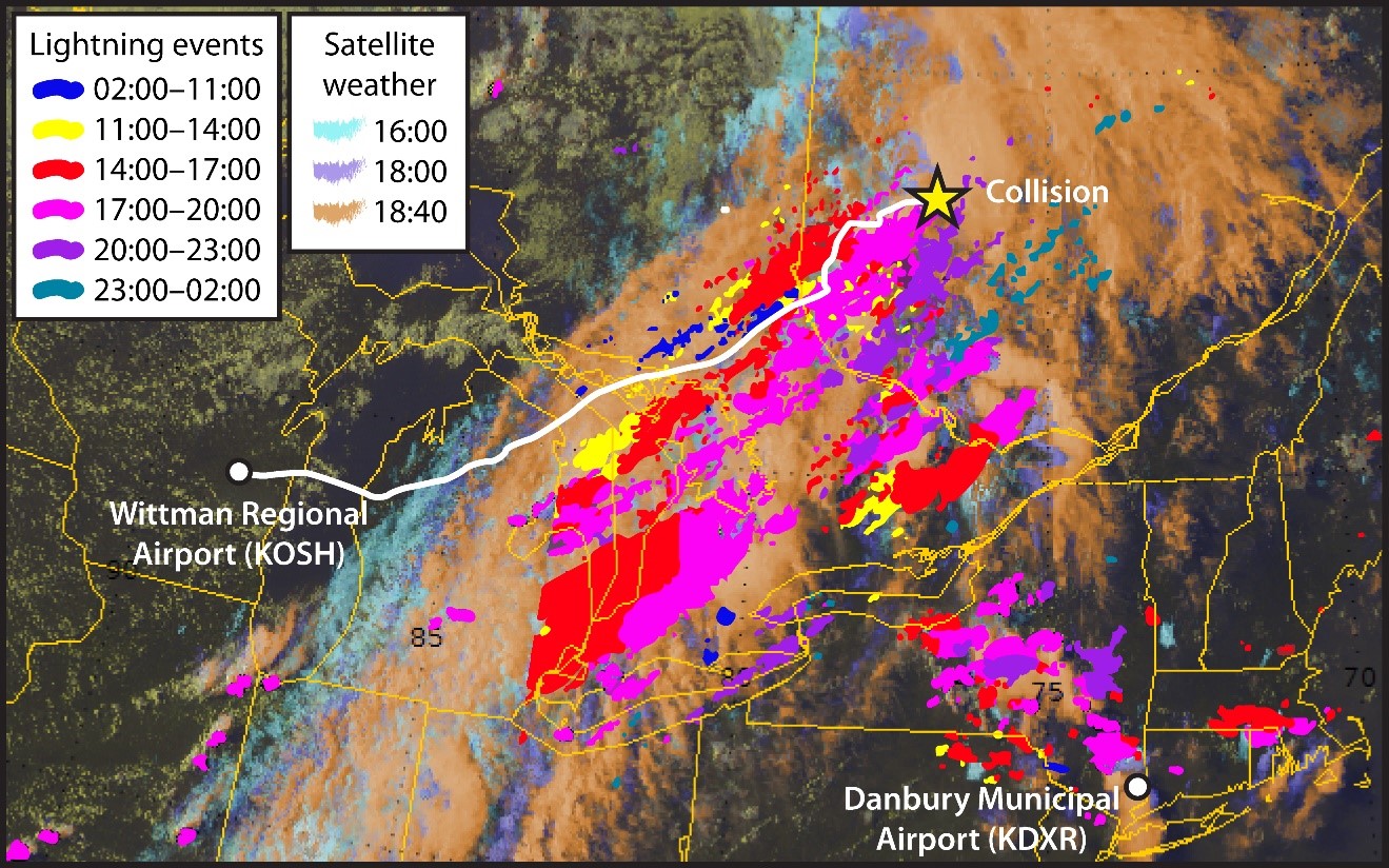 On 29 July 2019, at 1555 Eastern Daylight Time, the Beechcraft Bonanza V35B aircraft (registration N3804X, serial number D-10358) departed Wittman Regional Airport, Wisconsin, United States, for a daytime visual flight rules flight to Danbury Municipal Airport, Connecticut, United States, with only the pilot on board. Shortly after takeoff, the aircraft began to deviate north of the planned route and subsequently into Canadian airspace. At 1912, while in the vicinity of a line of rain showers, thunderstorms, and lightning, the aircraft entered a right turn, descended rapidly and collided with terrain approximately 7 nautical miles northeast of Senneterre, Quebec.