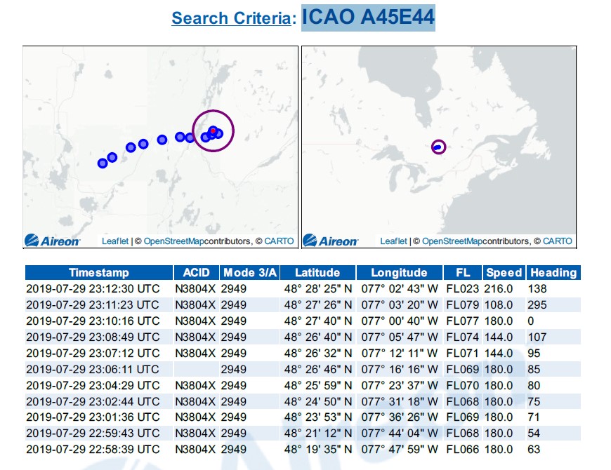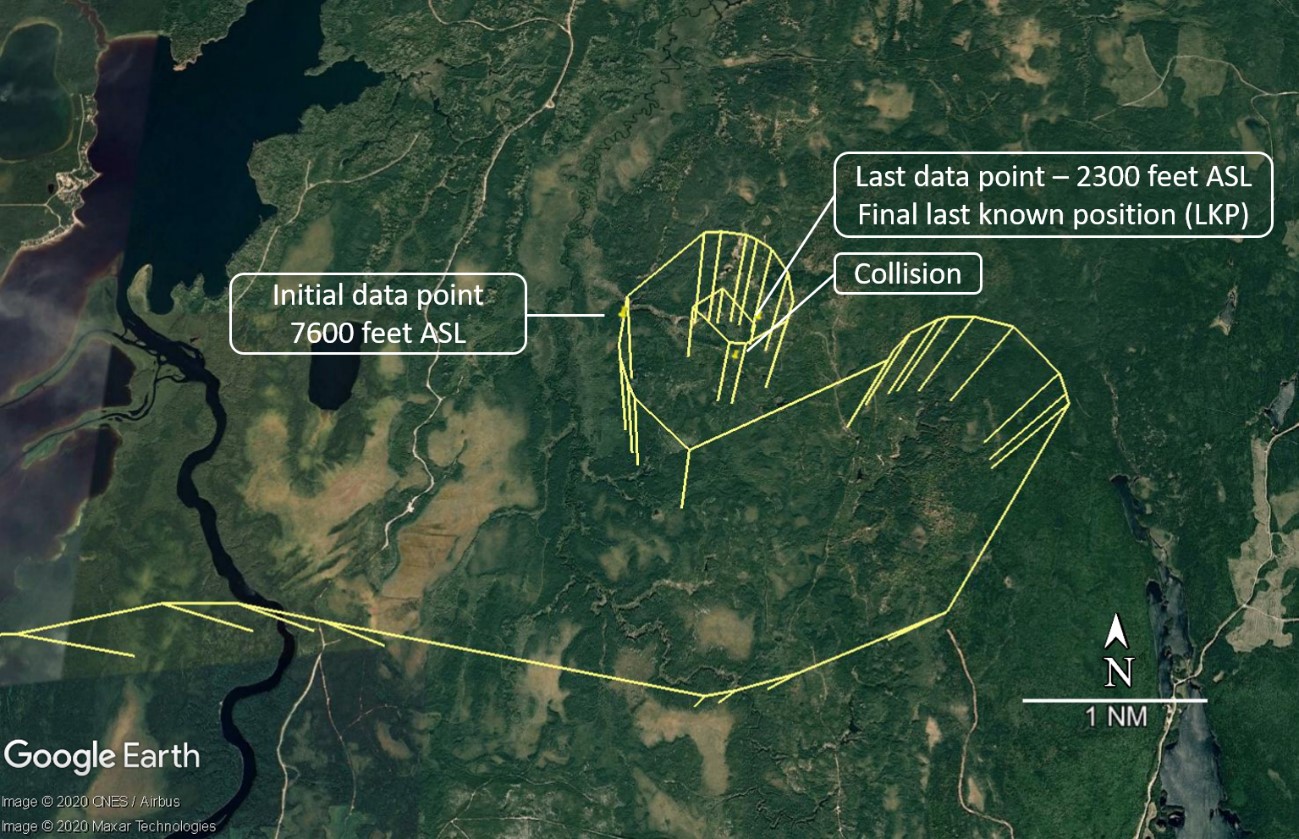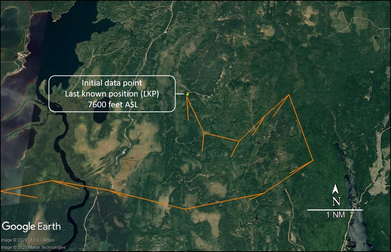 JRCC Trenton was notified that the aircraft was missing at 2331 on 29 July 2019, and initiated its SAR response. At 0049 on 30 July 2019, JRCC Trenton obtained some limited initial ground-based ADS-B data from the U.S. Air Force Rescue Coordination Center, which last recorded the aircraft’s GPS position and altitude at 1911:42. JRCC Trenton used this data point to determine the search area. This initial data matched data that was available on the internet through several different networks of private ground-based ADS-B receivers. The data point was at 48°28'02"N, 077°03'50"W, at an altitude of 7600 feet ASL, and was 4638 feet (0.76 NM) from the actual crash site (Figure 5).