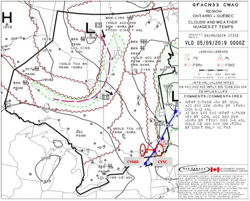 Graphic area forecasts (GFAs) show the general upcoming weather conditions for a given geographic area.Footnote 9 On the day of the occurrence, a clouds and weather chart issued at 1331 and valid at 2000, showed a low-pressure system located near Baie-Comeau, in eastern Quebec, with a cold front extending south into the U.S., moving eastward at 20 knots. The cold front was forecast to be west of CYSC at 2000 (Appendix A).
