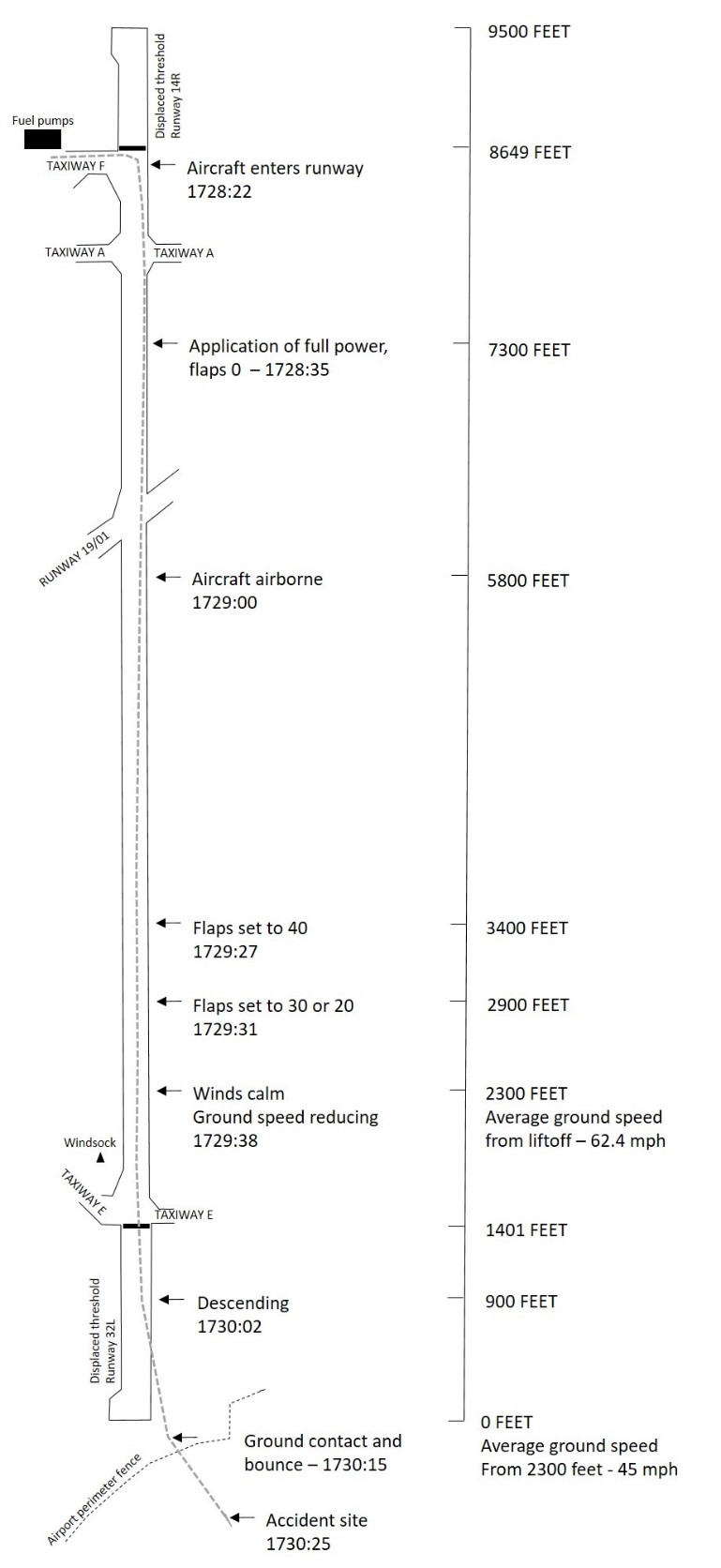 With 3400 feet of runway remaining, the pilot flying lowered the flaps from 0° to 40°. With 2900 feet of runway remaining, the pilot reduced the flap setting to either 30° or 20° where they remained; the exact setting could not be determined. With 2300 feet of runway remaining, the aircraft entered the area of calm wind as indicated by the limp windsock (Figure 2).