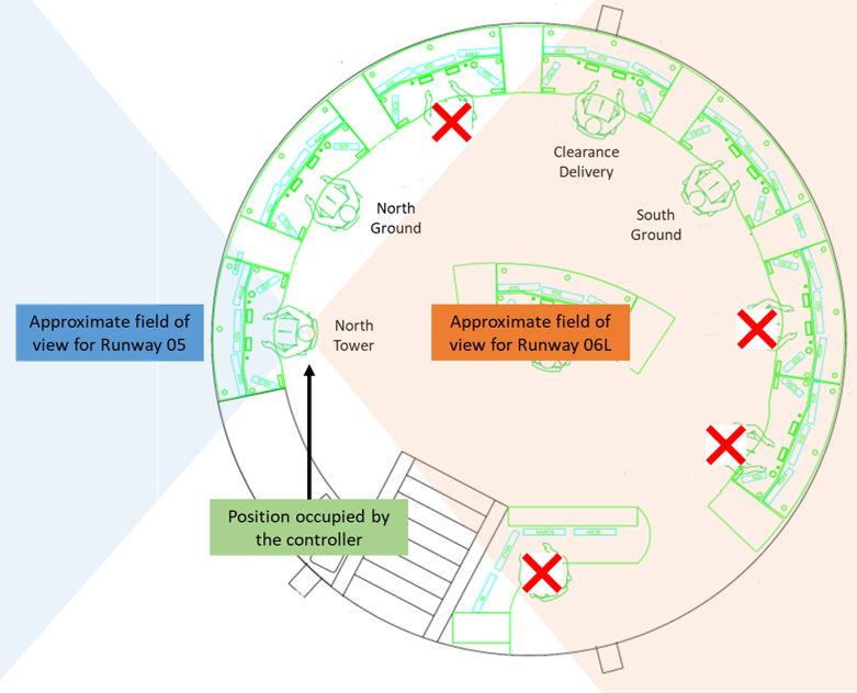 Because the controller was working from the north tower control position, he had to perform visual scans to monitor the thresholds of Runway 05 and Runway 06L, the departure end of Runway 06L, and the monitors at his CWP. To face either Runway 05 and the CWP or Runway 06L, he needed to turn 180°, and did so several times. This made it more difficult to visually monitor aircraft departing from Runway 06L because of the visual obstructions present when he was looking across the tower cab and out the window at Runway 06L.