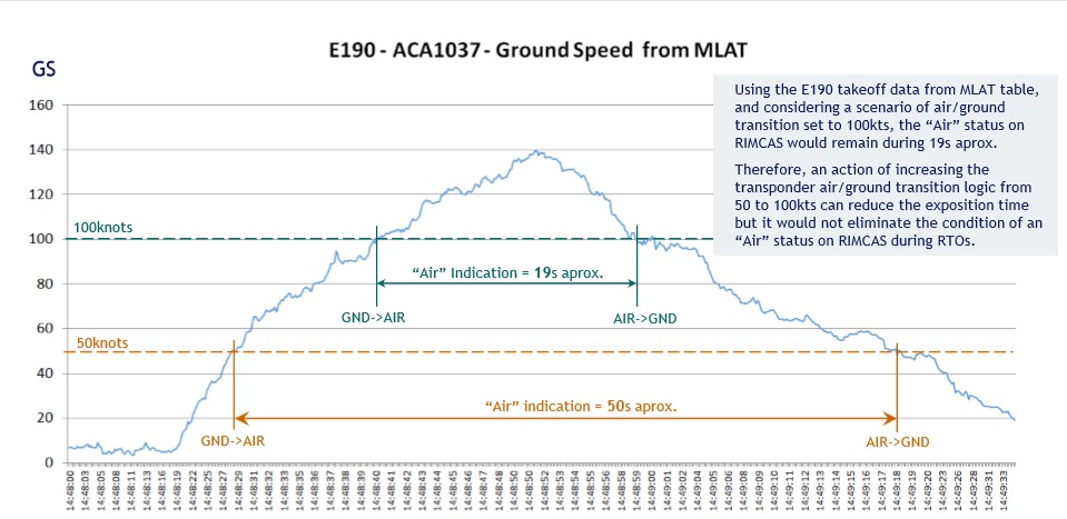 This investigation focused heavily on the inaccuracies found in the in-air status of the Embraer 190 and the RIMCAS. The Embraer 190 was identified as in air for approximately 52 seconds even though it remained on the ground. Simulations and an examination of flight data show that the Embraer 190 would have been identified as in air for approximately 19 seconds even if the DO-181 MOPS recommended airspeed of 100 knots had been applied.