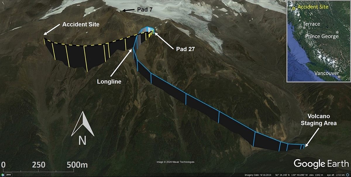 As the sole occupant, the pilot removed the helicopter’s external storage basket, fuelled the aircraft, and attached a 75-foot longline in preparation for the next task, moving a dismantled drill rig from Pad 27 to Pad 7, approximately 1400 feet to the northwest. The first set of lifts between the pads began at approximately 0800 and continued until approximately 0842, when the pilot returned to the Volcano staging area to refuel.