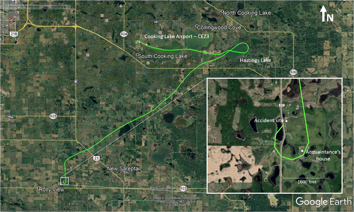 Details of the flight path (Figure 1, main image) were captured by a portable global positioning system (GPS) in the aircraft. After departing Runway 10 at CEZ3 on wheels, the aircraft flew 6 nautical miles (NM) east to Hastings Lake and conducted a water landing at 1045. After the landing, the aircraft departed the lake and conducted a left climbing turn before proceeding toward the town of Rolly View, Alberta.